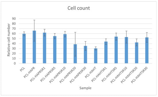 Relative cell adhesion was investigated for all the samples using images of fluorescence microscopy. Images were analyzed quantitatively with the help of ImageJ and results were presented as average cell number (Figure 18). In the case of composites containing precipitation-obtained SrHA, results are higher for lower Sr concentrations, while in the case of hydrothermal-obtained samples, better results are obtained at higher concentrations, apart from PCL–HAHT-Sr20%. Although pristine PCL scaffolds also had good results, in confirming the biocompatible nature of this polymer and its suitability in developing new composite materials, it is often considered that the improvement brought by the added HA/SrHA is more visible on longer periods of time [27].