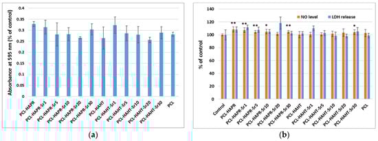 Biocompatibility evaluation of 3D-printed scaffolds, containing PCL and HA/SrHA obtained by precipitation and hydrothermal method, after 24 h of incubation with MC3T3-E1 pre-osteoblasts by measuring the viability of cells attached on these scaffolds: (a) cell viability was assessed by MTT assay and represented as mean ± SD (n = 2); (b) NO level and LDH release in culture medium. The results were calculated as mean ± SD (n = 3) and expressed relative to control (cells incubated without scaffolds) for NO and LDH assays (* p < 0.05 and ** p < 0.01 compared to control).