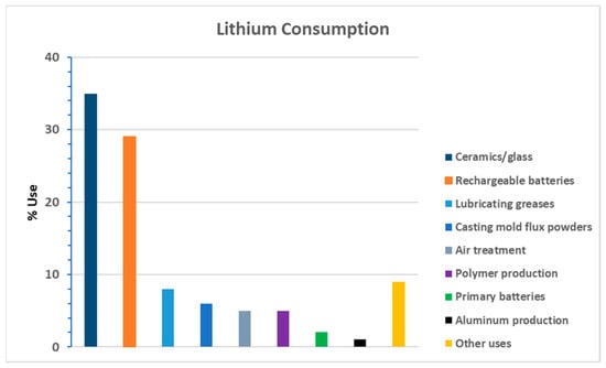 The transition to clean renewable energy storage devices, along with the growing popularity of EVs, has led to massive interest in Li production. Li has other attractive applications in various manufacturing sectors, including non-rechargeable batteries, ceramics, glasses, lubricating greases, electrocatalysis, and medicine, among other uses (Figure 1). The utility of Li in the clean renewable energy sector (e.g., rechargeable batteries) relates to its electrochemical activity and high specific heat capacity [1]. The excellent charge-holding capacity of Li and the efficient delivery of the stored power make this element attractive from an application and commercial perspective. According to the United States Geological Survey (USGS) [2], natural Li exists in various ores, including continental brines, claystone, geothermal brines, hectorite, oilfield brines, and pegmatites.