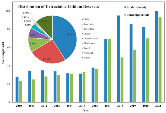 Global consumption of Li content from 2010 to 2020 and distribution of extractable Li reserves with existing technologies (reproduced from [6] with copyright permission).