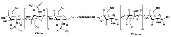 Chitosan (CTS) is a natural biopolymer derived from chitin, which is found in the exoskeletons of crustaceans, fungi, insects, and some algae [82,83]. The structure of CTS is shown in Figure 5 and comprises repeating units of glucopyranose rings with amine (–NH2 or –NHCOCH3) groups at the C-2 unit. The interest in the use of CTS as a binder for the granulation of LISs relates to its good solubility at mildly acidic conditions, low cost, biodegradability, non-toxicity, and hydrophilic nature.
