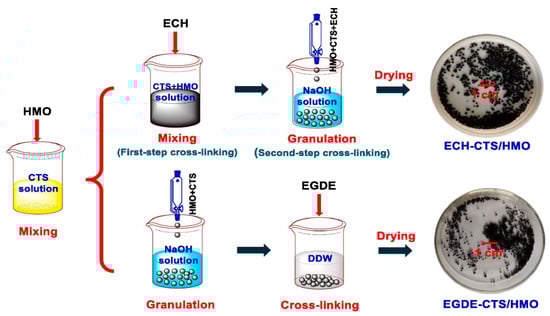Fabrication of ECH–CTS/HMO and its difference from the preparation of EGDE–CTS/HMO (reproduced from [49] with permission). the black arrows depict the reaction process, while the red arrows depict reagent addition.
