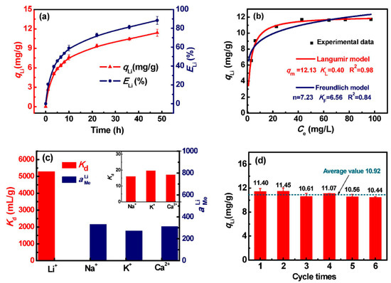Recovery of Li-ion from geothermal water by ECH–CTS/HMO: (a) Variations of adsorption capacity and recovery rate with time (S/L = 1 g/250 mL, pH = 12, T = 333 K); (b) adsorption isotherms and fitted curves with different isotherm models; (c) adsorption selectivity; (d) cyclic stability (reproduced from [49] with permission).