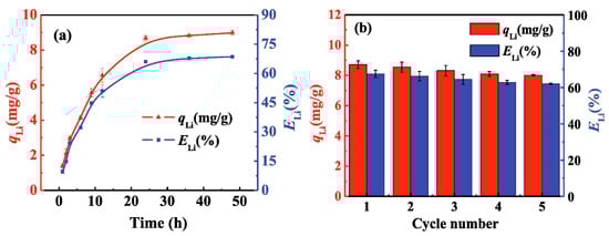 Adsorption of Li-ions from geothermal water by crosslinked CTS/HMO at a solid-to-liquid ratio of 1:200 and pH 12. (a) Variations of adsorption capacity and efficiency with time; (b) cycle stability (reproduced from [51] with permission).