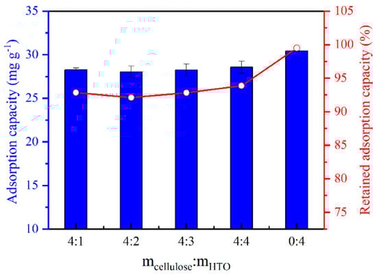 Qian et al. [69] developed a series of H2TiO3/CLS aerogels (HTO/CA) with a porous network for the selective recovery of Li ions from seawater. The granules were prepared by dissolving CLS in an ionic liquid [Bmim]Cl at 90 °C for 1 h. Subsequently, the LISs (HTO)–CLS mixture with variable CLS to HTO ratio (4:0, 4:1, 4:2, and 4:3) was prepared and thoroughly mixed to afford homogeneity. The resulting mixture was poured into a mold, and air bubbles were removed with the aid of a vacuum-drying oven, followed by coagulation in an ethanol bath for 24 h. The obtained hydrogel was washed with deionized water, pre-frozen at −12 °C, and finally freeze-dried under high vacuum conditions for 48 h. The HTO/CA sorbents were characterized using FTIR, XRD, SEM–EDS, contact angle, and nitrogen adsorption studies. Nitrogen adsorption results revealed a higher surface area for the HTO/CA (60.38 ± 2.65 m2/g) relative to HTO powder (22.77 m2/g), while XRD results noted similar diffraction patterns for HTO powder and HTO/CA [38,39,61] but decreased peak intensities for HTO/CA. The adsorption capacities of the aerogels with different HTO/CA mass ratios were tested, and it was observed that adsorption capacity increased slowly with an increase in the loading of HTO powder, as shown in Figure 11. The LIS aerogel with the highest HTO loading level (4:4) exhibited a slightly higher adsorption capacity of 28.58 ± 0.71 mg/g relative to the aerogels with other loading levels. The results show that following granulation, this HTO/CA material retained >90% of the adsorption capacity of HTO powder (cf. Figure 11). Further adsorption studies revealed that HTO/CA exhibited a 69.93 ± 0.04% Li removal from seawater with a high affinity for Li ions relative to other ions present in the matrix. Regeneration studies using LiCl solution showed that the Li adsorption capacity of HTO/CA changed slightly after the first five adsorption–desorption cycles, with the final adsorption capacity being 22.95 mg/g.