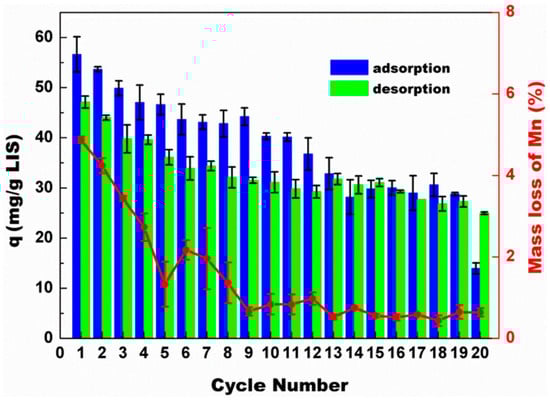 The physicochemical, morphological, thermal, and textural properties of the synthesized composite cryogels were characterized using XRD, SEM, TGA, and BET analysis. Results obtained from batch adsorption studies with LiCl show that alkaline pH conditions (pH 9.51) favored the adsorption of Li ions by the composite materials, where the adsorption capacity of LIS powder was 30.5 mg/g. For the LIS–HEC, the results reveal that adsorption capacity increased monotonically with increasing LIS loading up to 80% loading, before it dropped slightly at 100 wt% loading. The authors attributed the drop in adsorption capacity of LIS–HEC-100 to the agglomeration of LIS particles on the surface of the composite cryogel, suggesting a collapse and/or inaccessibility of the templated active binding sites. The adsorption results also revealed that the uptake capacity of LIS–HEC cryogel did not change with increasing loading of LISs but was at an average of 47.8 mg/g. Similarly, results from isotherm studies at pH 9.51 indicate that the adsorption capacity of LIS powder was 44.78 mg/g, while LIS–HEC had a higher uptake capacity of 54.23 mg/g. These results show that the cryogel skeleton did not negatively impact the adsorption properties of LISs particles in the granulated adsorbents. Furthermore, adsorption studies with an artificial brine and seawater show that the adsorption capacity was 10.64 mg/g for brine and 2.46 mg/g for seawater, where the composite cryogel demonstrated good selectivity for Li ions in both adsorbate systems. Dynamic adsorption studies with the LIS–HEC cryogels revealed that a higher flow rate decreased the time required for attaining adsorption equilibrium, with the consequence of decreased adsorption capacity. The adsorption capacities per unit time of the adsorbents were 22.36, 39.45, 41.67, and 60.39 mg/g/h for flow rates of 1.0, 2.0, 3.0, and 4.0 mL/min, respectively. Reusability studies via multiple adsorption–desorption cycles indicate that the adsorption capacity of the granulated cryogel decreased by 49.11% after 19 cycles, where the desorption capacity followed the same trend. The decline in adsorption capacity was gradual during the first 10 cycles, where the tenth adsorption capacity was 71.25% of the initial value. From the 12th cycle, the adsorption capacity was stable till a sharp decrease was observed during the 20th cycle. Similarly, Mn loss showed the same trend, which indicates that the main reason for the attenuated adsorption capacity was the loss of Mn ions. Reusability results for the LIS–HEC cryogels are presented in Figure 15, where the adsorption–desorption trends show great promise for the HEC cryogel-immobilized LISs. The synthetic strategy employed by Liu et al. [71] and Xie et al. [52] are similar. Both authors crosslinked the prepared granules, though the crosslinking strategies were different. For example, Liu et al. [71] crosslinked CLS before granulation, whereas Xie et al. [52] crosslinked CLS during and after the granulation process. The results obtained by Xie et al. [52] further affirm the importance of crosslinking before granulation, in agreement with the study by Ding et al. [49].