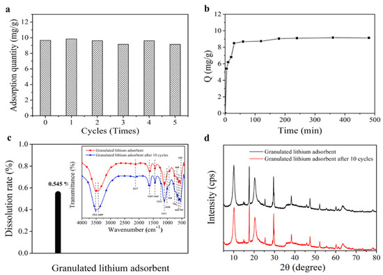 Lithium extraction from East Taigener Salt Lake brine. (a) Adsorption quantity change of granulated adsorbents after five adsorption–desorption cycles; (b) adsorption kinetic curve; (c,d) dissolution rate of granulated lithium adsorbents, structural change characterized by IR spectroscopy and XRD before and after 10 adsorption–desorption cycles (reproduced from [24] with permission).