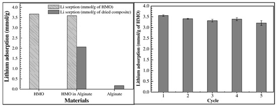 Comparison of the adsorption capacity of Li+ to different materials. Initial Li+ concentration 4.23 mM, volume 20 mL, the mass of HMO 20 mg, the mass of wet HMO–Al beads 0.56 g (corresponding to 20 mg HMO), pH 8.5, and time 24 h. Change in the Li+ adsorption capacity to HMO–ALG beads with reuse time. For adsorption: Initial Li+ concentration 4.23 mM in 0.1 M CaCl2, volume 20 mL, mass of wet HMO–ALG beads 0.56 g (corresponding to 20 mg HMO), pH 8.5, and time 24 h. For desorption: 40 mL mixture of 0.1 M HCl and 0.1 M CaCl2 for 12 h (reproduced from [73] with permission).