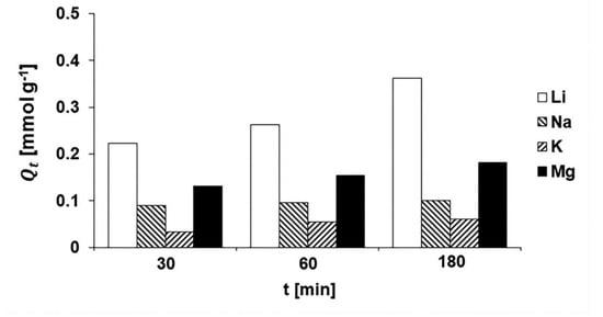 Comparisons of adsorption capacities of HMO/ALG(Al) for Li+, Na+, K+, and Mg2+ cations from multi-ion solutions containing 750 mg L−1 of each salt cation according to incubation time. (Reproduced from [74] with permission).