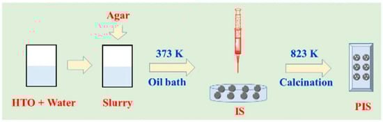 The adsorption properties of Ti-based LISs identified as ion sieves (ISs) and porous ions sieves (PISs) with enhanced post-separation ability and high-performance Li recovery from geothermal water were reported by Chen et al. [77]. The synthetic procedure for ISs and PISs is schematically shown in Figure 24 and described as follows: Li2TiO3 (LTO) precursor was de-lithiated using 0.25 M HCl and a mass/volume ratio of 1 g/L at 333 K for 12 h to obtain the corresponding HTO powder. Following de-lithiation, the HTO powder and AG were mixed at variable mass ratios (1:1, 2:1, 3:1, 4:1, and 5:1) using deionized water and heated to 373 K with stirring until the AG became molten. The resulting molten slurry was granulated by dropping it into cold simethicone via an injector. The granules were left in the granulation solution for 24 h, cleaned using petroleum ether, and dried to obtain the granulated LISs (IS-1 to IS-5). The corresponding PIS was obtained after calcination of IS in air at 823 K for 1 h (cf. Figure 24).