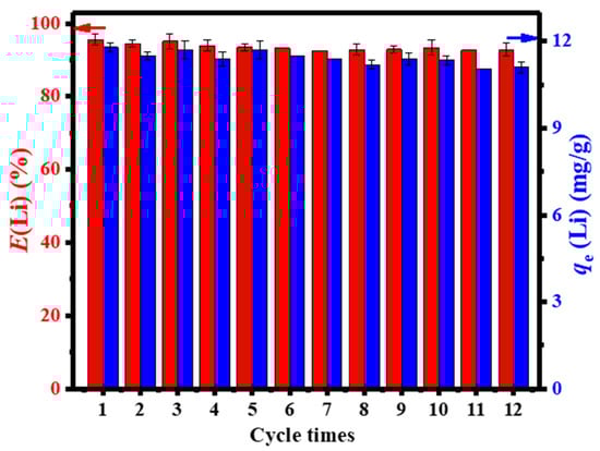 Zhang et al. [70] reported the preparation of high-specific surface LISs templated by bacterial CLS for the selective adsorption of Li ions. The templated LISs were synthesized as follows: Bacterial CLS (B-CLS) hydrogel was added to deionized water for 15 min to enhance swelling, followed by freezing with liquid nitrogen and freeze-drying to obtain a B-CLS aerogel network structure. The B-CLS aerogel network was soaked in titanium ethoxide solution for 2 h, rinsed with ethanol and ultrapure water about 4 to 5 times, followed by stirring in ultrapure water for 2 h, and washed again with deionized water. Finally, the obtained TiO2/B-CLS material was dried in the oven. The prepared templated LIS was characterized through FTIR, SEM, nitrogen adsorption, and XRD studies. Adsorption studies with the B-CLS templated LISs revealed that uptake was favored at alkaline pH conditions (pH 11), where increasing time favored the adsorption process till about 200 min. A maximum adsorption capacity of 35.45 mg/g was achieved at an equilibrium time of 6 h, which represented 80% of adsorption efficiency. The authors also reported that the B-CLS templated LISs display good selectivity for Li ions as well as strong regeneration ability, where the adsorption capacity remained above 82% of the initial value after five adsorption–desorption cycles, as shown in Figure 13. The synthetic strategy employed by Zhang et al. [70] is similar to the study of Qian et al. [69], where the notable difference between the two synthetic strategies relates to the use of an ionic liquid ([Bmim]Cl) for the dissolution of CLS by Qian et al. [69].