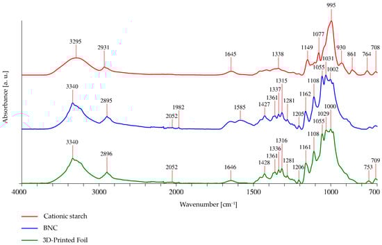 FT-IR spectra of BNC, cationic starch, and 3D-printed foil.