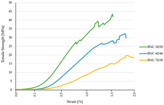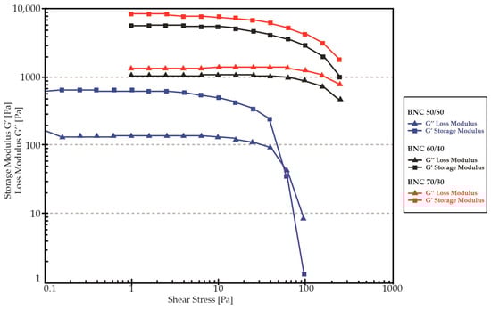 In general, it can be observed that for all samples, the storage modulus values are higher than the loss modulus values; this is indicative of the viscoelastic properties of the solid, which is a primary prerequisite for successful 3D printing []. In general, the BNC 70/30 sample has the highest values, the BNC 60/40 sample has slightly lower values, and both have about 1000 Pa higher loss modulus values and about 7000 Pa higher storage modulus values compared to the BNC 50/50 sample. It may be noted that the BNC 50/50 sample has the lowest linear response range of around 10 Pa, and consequently, its structure will fail at lower loads than the other two samples. This suggests that BNC 60/40 and BNC 70/30 could have been 3D-printed at much higher pressures than BNC 50/50, but due to the printer used in this study, these pressures were not reached, and thus the structure of neither sample was destroyed.