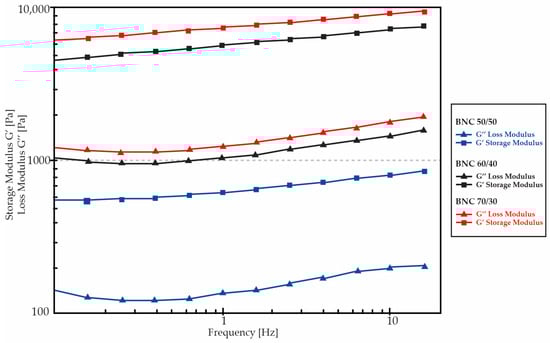 Figure 3 shows the results of frequency measurements of the BNC samples taken at a stress constant in the range of the linear viscoelastic response (previously determined by amplitude tests: Figure 2). Again, greater variation between the BNC 50/50 sample and the BNC 60/40 and BNC 70/30 samples can be observed, while the shape of the curve remains similar for all of them. Notably, the dynamic moduli (G’ and G”) show very little frequency dependence, with the storage modulus dominating over the entire range of frequencies studied; all samples exhibit gel-like behavior, as suggested by subsequent experimental work.