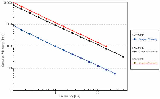 Frequency test, complex viscosity vs. frequency at 1 min pre-treatment γ͘ = 0.0001 s−1 (blue—BNC 50/50, black—BNC 60/40, red—BNC 70/30).