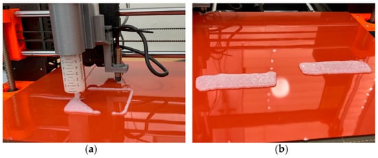 The 3D printing of the hydrogel with the Prusa MKS3+ printer. (a) The 3D printing process; (b) Final 3D-printed plates.
