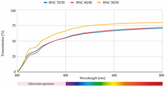 UV-VIS analysis, or spectrophotometry, which considers the ultraviolet and visible parts of the electromagnetic spectrum to analyze substances, was used to determine the transparency of 3D-printed foils. A UV-VIS Lambda 850 spectrometer (PerkinElmer, Shelton, CT, USA) was used for the purpose of this research. Measurements were carried out between 200 and 800 nm wavelengths with a step of 2 nm.