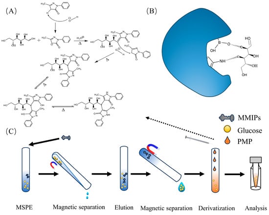 (A) Reaction of glucose derivatization; (B) mechanism of sorbent adsorption; (C) process of MSPE experiments.