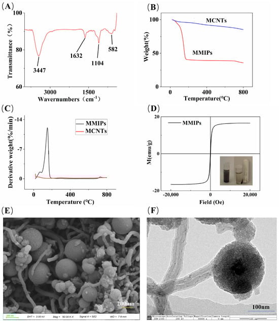 (A) FTIR spectrum of MMIPs; (B) TGA curves of MMIPs and MCNTs; (C) plot of TGA derivative weight data; (D) VSM plot of MMIPs; (E) SEM image; and (F) TEM image of MMIPs.