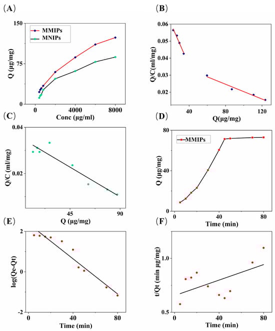 (A) Adsorption isotherms of MMIPs and MNIPs; (B) Scatchard analysis of MMIPs; (C) Scatchard analysis of MNIPs; (D) the effect of the contact time on the absorption capacity of MMIPs; (E) the pseudo-first-order kinetics; and (F) the pseudo-second-order kinetics for MMIPs.