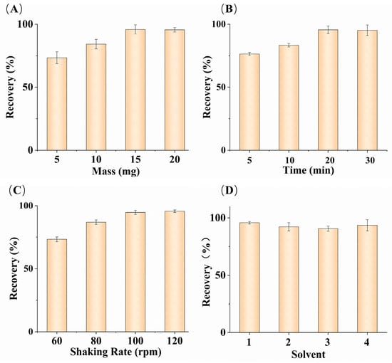 Effects of MMIPs mass (A); oscillation time (B); oscillation rate (C); different elution solutions (D). ((D), solvent (1) deionized water; (2) 20% ACN–water solution; (3) 20% methanol–water solution; (4) mixture of 20% ACN and 80% ethanol) (n = 3).