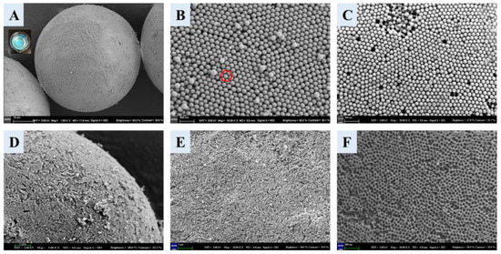 SEM images for whole SCCB (A), microscopic structure of SCCB surface (B), microscopic structure for surface of filled SCCB (C), and SEM images for 3DOM material surface structure (D–F). Magnification for each image: (A), 1500; (B), 20,000; (C), 20,000; (D), 5000; (E), 10,000; (F), 20,000. The red circle suggested that the surface of the microsphere was a face center cubic (FCC) structure.