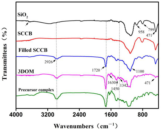 To further characterize the boronate affinity 3DOM material, an IR spectrum was obtained for each preparation step (Figure 3), which was obtained using the KBr method. In the spectrum for the monodispersed SiO2, the absorption peak that appeared at 3500–3700 cm−1 was the stretching vibration peak of Si-OH. The broad and strong peak at 1100 cm−1 was the asymmetric stretching vibration peak of Si-O bond. The absorption peak that appeared at 958 cm−1 belonged to the bending vibration absorption peak of Si-OH. The two absorption peaks at 799 cm−1 and 471 cm−1 were the symmetric stretching vibration peak and bending vibration peak of the Si-O bond, respectively. In the spectrum for calcinated SCCB, the absorption peaks for Si-OH at 3500–3700 cm−1 and 958 cm−1 disappeared, suggesting that the Si-OH group was completely condensed into a Si-O-Si bond during the calcination. In the spectrum for the SCCB filled with the precursor solution, compared with the SCCB without filling, the newly appeared absorption peak at 1720 cm−1 was the ester carbonyl peak of EGDMA. The absorption peak at 2926 cm−1 was the stretching vibration peak of the C-H bond. The two absorption peaks at 1630 cm−1 and 1450 cm−1 belonged to the benzene ring skeleton vibration peak of VPBA, and the peak at 1342 cm−1 was the B-O bond absorption peak from VPBA. The appearance of these peaks demonstrated that the precursor solution had been successfully filled into the SCCB and that polymerization occurred. In the spectrum of the 3DOM material with the template removed, the absorption peak of the silicon oxygen bond at 471 cm−1 was significantly decreased compared to the spectra for SiO2 and filled SCCB. Moreover, the absorption peak at 799 cm−1 disappeared, and the peak at 1100 cm−1 was altered. All these changes proved the successful removal of the silica colloidal crystal template by HF. To further prove the removal of the template, the IR spectrum for the precursor solution bulk polymerization product was obtained. As can be seen, the absorption peaks in the spectra for the 3DOM material and precursor complex were consistent, which proved the successful removal of the template.