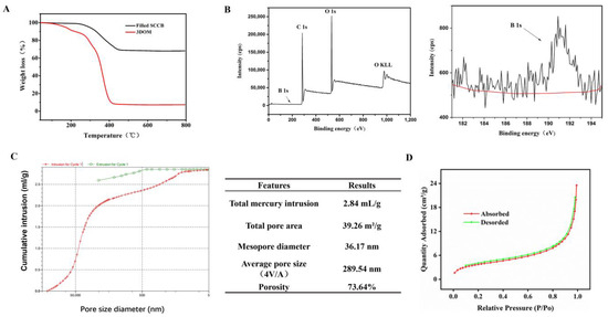 To verify whether the precursor solution was successfully filled into the voids of the SCCBs, X-ray photoelectron spectroscopy (XPS) was performed for the template-removed 3DOM material (Figure 4B). In the figure, we can see peaks for B 1s (191.01 EV), C 1s (284.82 EV), O 1s (532.71 EV) and other peaks, suggesting that the final 3DOM material contained boron, carbon, oxygen, and other elements. These elements obviously did not exist in the silica template but were from precursor polymers, indicating that the precursor polymers were successfully filled into the voids of the SCCBs.