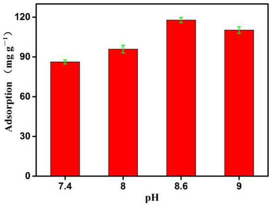 The adsorption properties of the boronate affinity 3DOM material were evaluated based on its capture of cis-diol groups. The pH of the solution is an important factor affecting the adsorption properties of a material [43], and it is especially important for the reversible covalent reaction between cis-diol-containing compounds and boronic acid ligands [24,44]. Therefore, the adsorption capacity of OVA was evaluated using solutions with different pH values. The pH of the solution was adjusted using a 0.01 M NaOH solution. When the pH increased from 7.4 to 8.6, the adsorption capacity increased significantly from 87.24 mg/g to 117.83 mg/g, reaching a maximum (Figure 5), which was consistent with the pKa (8.62) of 4-vinyl phenyl boronic acid reported in the literature [45]. According to the principle of boronate affinity, under the conditions of low pH (pH < pka = 8.60), only a small amount of inactive boronic acid groups (triangular configuration, SP2) can be converted into reaction forms (tetrahedral configuration, SP3). Therefore, the adsorption is relatively small at pH7.4 and pH8.0. Although the adsorption is also relatively large at pH9.0, considering the impact of an alkaline environment on OVA proteins [46], the subsequent experiment was carried out at pH8.6.