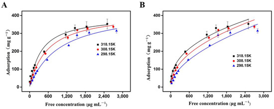 The adsorption of OVA by the 3DOM material fitted with the Langmuir model (A) and Freundlich model (B). A total of 5 mg of 3DOM was added into 2 mL of OVA solution of different concentrations at a pH of 8.6, and the adsorption was measured at temperatures of 318.15 K, 308.15 K, and 298.15 K, respectively.