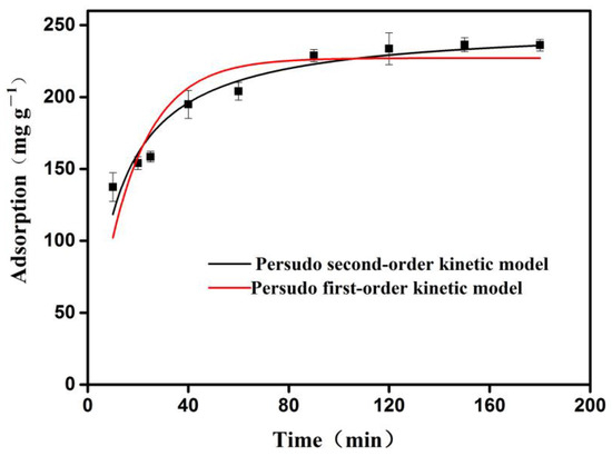 As shown in Figure 7, the red curve is the pseudo first-order dynamic model, and the black curve is the pseudo second-order dynamic model. The adsorption of OVA by the 3DOM material showed typical adsorption kinetic characteristics. As the time increased, the adsorption rate gradually decreased. The reason was that the OVA molecules were adsorbed on the surface of the 3DOM material at the initial stage while encountering resistance after being diffused into the pores. This rapid and efficient adsorption can be attributed to the high porosity and the uniform distribution of the abundant active sites on the 3DOM materials, which was consistent with the above isothermal adsorption analysis results.