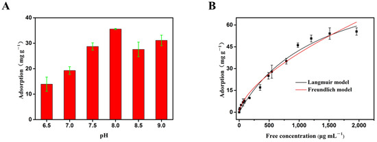 Following OVA, we measured the adsorption of adenosine, another cis-diol-containing molecule by the boronate affinity 3DOM material. As shown in Figure 8A, the adsorption capacity increased significantly from 13.92 mg/g at pH 6.5 to 38.58 mg/g at pH8.0, where it reached a maximum. Therefore, pH8.0 was chosen for the subsequent experiment.