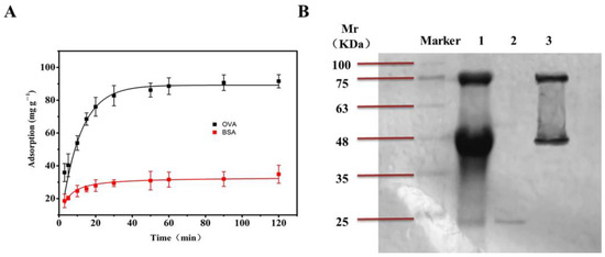 In order to evaluate the adsorption specificity of the boronate affinity 3DOM materials towards cis-diol-containing compounds, glycoprotein OVA and non-glycoprotein BSA were subjected to adsorption experiments under the same conditions. As shown in Figure 9A, with the increase in concentration, the adsorption of OVA gradually increased and finally stabilized to 314.28 mg/g, while for BSA, the maximum adsorption was only 127.27 mg/g. The reason is that as a non-glycoprotein, BSA contains no cis-diol group and therefore cannot bind to the boronic acid site on the material. The small amount of BSA adsorption was due to non-specific adsorption. In the contrast, OVA contains a cis-diol group that can form a covalent bond with the boronate acid group on the surface of the 3DOM material. Overall, these data indicated that the boronate affinity 3DOM material can selectively adsorb compounds containing cis-diol groups.