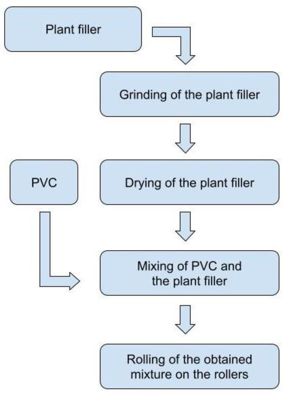 The components (PVC composition and PF) were mixed for three minutes using a high-speed mixer (HENSCHEL, Kassel, Germany) until a homogeneous mixture was obtained. The resulting mixture was fed to laboratory rollers (Schwabenthan Maschinenfabrik. Berlin, Germany) type Polymix 150U heated to a temperature of 175 °C to obtain a melt. The melt was rolled at the speed of 24 rpm for two minutes to obtain polymer composite films with a thickness of 500 ± 5 µm. The technological scheme is shown in Figure 1.