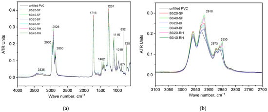 Averaged IR spectra of plant-filled polymer films based on highly plasticized PVC: (a) full spectra range and (b) the characterized peaks of plant fillers, where 1—unfilled PVC, 2—80/20−SF, 3—60/40−SF, 4—80/20−BF, 5—60/40-BF, 6—80/20−RH, 7—60/40−RH.