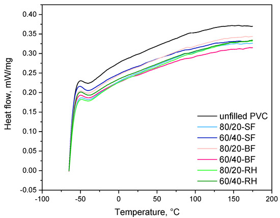 Since plant raw materials are sensitive to heat treatment and are characterized by flammability and poor thermal stability, the study of the thermal characteristics of the composites obtained in the work is important to determine the conditions of applicability of such polymeric materials. Thermograms were carried out by differential scanning calorimetry (Figure 5). All DSC curves show the absence of a glass transition temperature for PVC. This is primarily due to the presence of a high-molecular plasticizer in the composition of the composites, which is dioctyl terephthalate with a glass transition temperature of minus 67 °C.