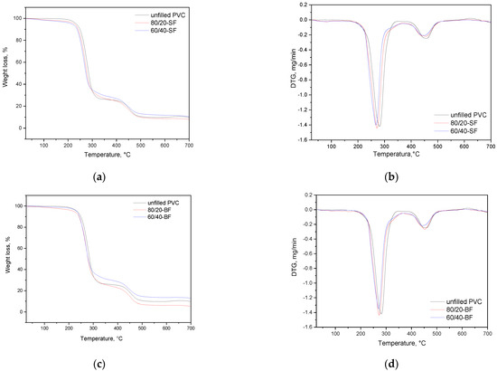 Plant-filled polymer films based on highly plasticized PVC were investigated by thermogravimetric analysis under argon atmosphere to understand their thermal behavior. Thermograms of the studied polymer composite films are shown in Figure 6.