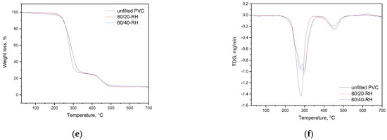 TGA and DTG curves of plant-filled polymer films based on highly plasticized PVC: (a,b)—with addition of SF, (c,d)—with addition of BF, (e,f)—with addition of RH.
