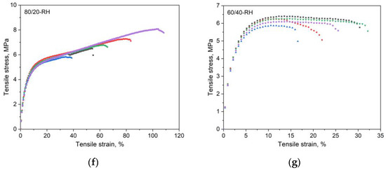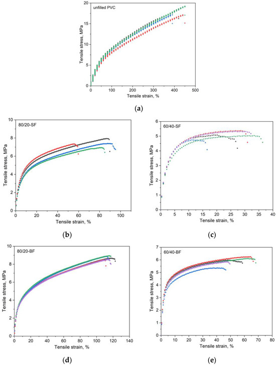 Stress–strain diagrams of plant-filled polymer films based on highly plasticized PVC, where (a)—unfilled PVC, (b)—80/20-SF, (c)—60/40-SF, (d)—80/20-BF, (e)—60/40-BF, (f)—80/20-RH, (g)—60/40-RH. Colors show the different strain-stress measurements of the sample (from 1 to 5).