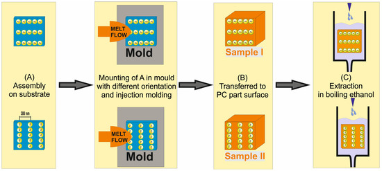 In previous works, disordered silica [16], gold [17], and calcite [18] nanoparticles were successfully transferred to plastic surfaces during injection molding or by 3D printing. The particles were applied in advance to a substrate or mold surface and subsequently brought into contact with a thermoplastic melt. As a result, plastic surfaces with partly embedded nanoparticles were obtained. Parts of the transferred particle surfaces were still accessible for small molecules, as we demonstrated by the catalytic effect of embedded AuNPs [17].