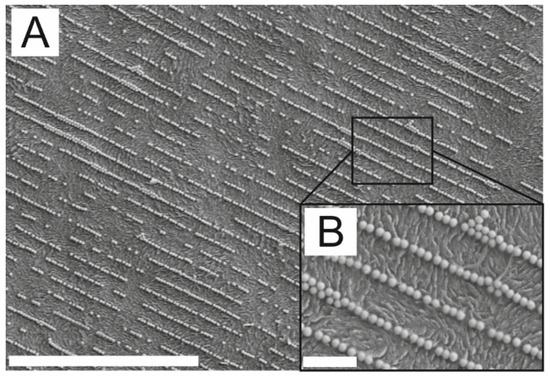 (A) SEM images of AuNP line assembly on PC after ethanol extraction, with AuNP lines aligned parallel to the melt flow direction. (B) Section from A with higher magnification. Scale bars are 5 µm for (A) and 0.5 µm for (B).