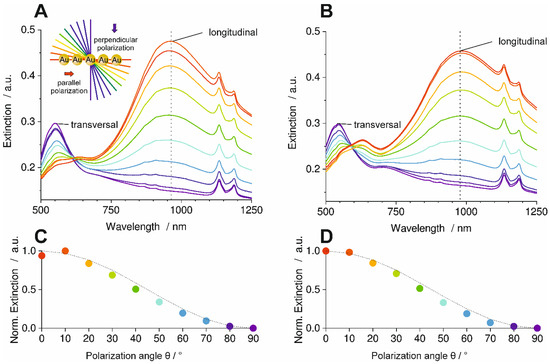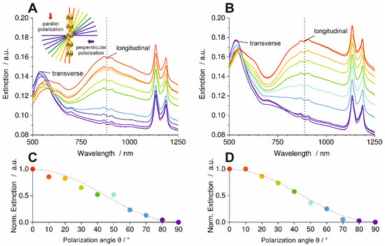 The spectra in Figure 7-A show multiple bands that are assigned to the PC, like in Figure 4. The transversal plasmon resonance band of the AuNP appears at 0° polarization (perpendicular to the AuNP lines) and is located at 549 nm. The band intensity decreased with the increasing polarization angle, whereas the longitudinal band aroused with a maximum at 960 nm. The longitudinal mode is the most intense at a polarization angle of 90°, i.e., polarization parallel to the AuNP lines. The anisotropic behavior of the particle lines is clearly demonstrated by the relation of the intensities of the transversal and longitudinal bands.
