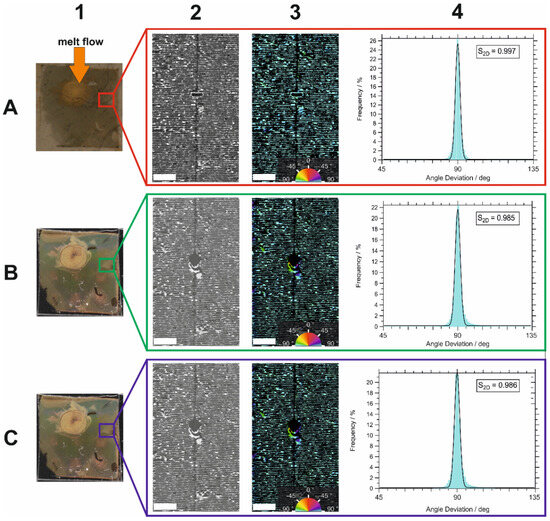Orientation analysis of Sample II. Identical ROI of the same AuNP line assembly on (A) original substrate, (B) PC after injection molding, and (C) PC after ethanol extraction, with particle lines aligned perpendicular to the melt flow direction; (1) photographs of AuNP assembly on the original substrate, with direction of melt flow (orange arrow) (A1), on PC (B1), and on PC after ethanol extraction (C1); (2) SEM images of identical ROI of the same AuNP lines on surfaces of 1; (3) color-coded SEM images of 2, where color represents orientation angle of the AuNP lines; (4) distributions of orientation angle deviation (α − αref) from reference direction extracted from SEM images in 3 with calculated 2D order parameter S2D. Photos and SEM images of (B,C), respectively, were mirrored with respect to (A) to get the same orientation. Scale bars are 5 µm.