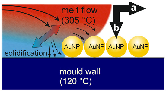 The statement that no significant changes in the structure of the AuNP line assemblies occurred, independently of the orientation of the lines relative to the flow direction, is remarkable at first glance. One would expect a shift of particles along the flow direction of the melt. This would lead to a change in interparticle distance and reorientation of lines in the case of parallel melt flow, or in bending of the lines in the case of perpendicular melt flow. However, we did not observe this. It only occurred rarely at structural defects. To understand this behavior, the characteristic of flowing melt is considered. A thermoplastic melt is a high-viscous liquid. As such, it exhibits a lamellar flow in the mold cavity. The melt is at a much higher temperature than the mold wall. In our case, the mold temperature is below the glass transition temperature of the PC. Thus, as soon as the PC melt contacts the mold wall, a small melt volume segment immediately cools down and freezes. This leads to a velocity gradient between the center of the cavity and the wall, where the velocity equals zero. In contrast, a melt segment on the melt front in the center of the cavity has a high temperature and high velocity. Successional injected melt moves this segment towards the wall surface, whereby the flow vector is normal to the wall surface. This is the typical situation during fountain flow, as shown in Figure 6. Thus, for small particles, velocity components in the main direction of the melt flow are negligible, and the small particles remain in place. Probably, larger particles may be affected by this component. However, it was not observed for the nanoparticles used here. In the case of two small particles in close vicinity, the melt could spread on the particle surface if the interfacial energy between particle and melt is high, thereby pushing the particles apart. However, a breaking down of the assembly structure was not observed. Probably, rapid cooling of the melt upon contact with the mold wall may have resulted in freezing of the melt, which conserved the assembly structure. Only for stacked particles in the observed defect structures that impose higher friction on the melt, the influence of the melt flow is not negligible, which can facilitate particle displacement. Overall, the assembly structures on the substrate are almost completely reproduced during transfer to the PC part by injection molding, independent of the flow direction of the melt.