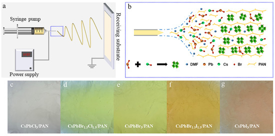 (a,b) Schematic of the one-step single-axis electrospinning setup to fabricate the perovskite light-emitting nanofibers. Photographs of as-synthesized CsPbX3/PAN samples: (c) CsPbCl3/PAN, (d) CsPbBr1.5Cl1.5/PAN, (e) CsPbBr3/PAN, (f) CsPbBr1.5I1.5/PAN, (g) CsPbI3/PAN.