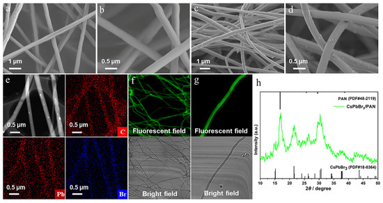 (a,b) SEM images of pure PAN nanofibers. (c,d) SEM images of CsPbBr3/PAN (CsBr:PbBr2 is 1:1) composite nanofibers. (e) TEM images of CsPbBr3/PAN composite nanofibers. EDS mapping for C, Pb and Br elements. (f,g) Fluorescent field images and bright-field images of CsPbBr3/PAN composite nanofibers recorded by LSCM, (h) XRD patterns of CsPbBr3/PAN composite nanofibers.