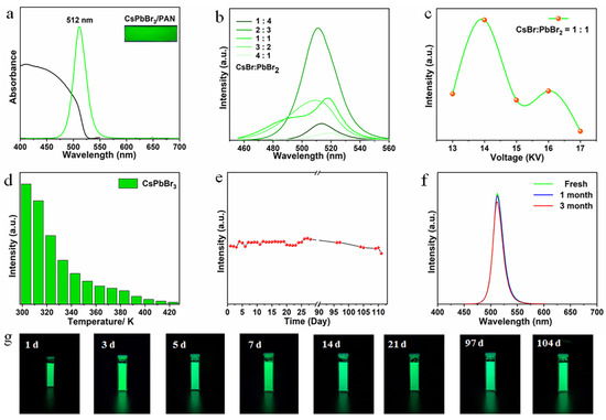 CsPbBr3/PAN composite nanofibers: (a) UV-vis absorption and PL spectra. (b) Different ratios of CsBr and PbBr2. (c) Different voltage. (d) Thermostability under 423 K. (e) Temporal evolution of PL intensity in room-temperature water. (f) Long-term storage stability. (g) Photos of CsPbBr3/PAN composite nanofibers dipped in water for 1, 3, 5, 7, 14, 21, 97 and 104 days.
