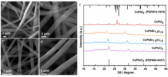 (a,b) SEM images of CsPbX3/PAN composite nanofibers: (a) CsPbCl3. (b) CsPbBr1.5Cl1.5. (c) CsPbBr1.5I1.5. (d) CsPbI3. (e) XRD patterns of CsPbX3/PAN composite nanofibers.