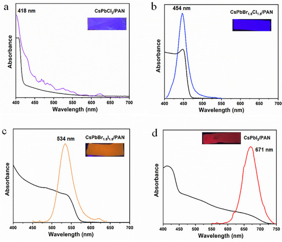 The UV-vis absorption spectra of the four multicolor CsPbX3/PAN composite nanofibers are shown in Figure 5. The purple CsPbCl3/PAN composite nanofiber (Figure 5a) exhibits a PL peak at 418 nm and a UV–visible absorption peak at 410 nm. The blue CsPbBr1.5Cl1.5/PAN composite nanofiber (Figure 5b) shows a PL peak at 454 nm and a UV–visible absorption peak at 448 nm. The orange CsPbBr1.5I1.5/PAN composite nanofiber (Figure 5c) displays a PL peak at 534 nm and a UV–visible absorption peak at 472 nm. Lastly, the red CsPbI3/PAN composite nanofibers (Figure 5d) reveals a PL peak at 671 nm and a UV–visible absorption peak at 415 nm. By comparing the UV-vis absorption spectra of composite nanofibers composed of four different halogens, it can be observed that as the halide composition changes from Cl− to I−, the CsPbX3/PAN composite nanofibers exhibit higher absorbance in the ultraviolet and visible spectral regions [26]. Subsequently, thermal stability tests were conducted on the four aforementioned composite nanofiber films. The results indicated that samples doped with halogen element iodine exhibit excellent thermal stability (Figure S5).