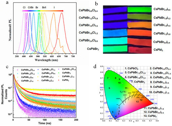 Figure 6a illustrates the photoluminescence (PL) spectra of all CsPbX3/PAN composite nanofibers, and their emitting wavelengths range from 418 to 671 nm. Unlike traditional cadmium-based QDs, the emission color of which is adjusted via the quantum size effect, the CsPbX3/PAN composite nanofibers show the flexible tunability of emission color via simply modifying the PQD compositions. Figure 6b presents corresponding actual luminescent photographs under 365 nm ultraviolet excitation, displaying vivid and vibrant colors. Later, time-resolved single-photon counting spectroscopy was employed. From Figure 6c, it can be observed that the average PL lifetime of composite nanofibers prepared with halide elements Br and Cl doping is smaller than that of PQD nanofiber films doped with Br and Cl. (Table S1). This behavior aligns with PL decay patterns of PQDs reported in the literature [27,28,29]. As the halide atom radius increases at the X site (Cl− = 1.81 Å, Br− = 1.96 Å, I− = 2.20 Å), it leads to the enlargement of the bandgap of PQDs, thereby increasing the carrier recombination rate. On the other hand, different halide elements can induce changes in the band structure of PQDs, which may affect the formation and recombination rate of electron–hole pairs, consequently influencing the fluorescence lifetime [27].The luminescent films of PQD nanofibers prepared by electrospinning differ significantly from traditional lanthanide-doped phosphors. CsPbX3/PAN composite nanofibers, with their narrow FWHM and tunable emission, can generate saturated, single-color luminescence [30,31,32]. The CIE coordinates, as shown in Figure 6d, illustrate the broad color gamut of these CsPbX3 PQDs (Table S2). Considering the excellent micolor emission properties and exceptional stability of the electrospun composite films, these samples hold great promise for multicolored optoelectronic applications in aquatic environments in applications of counterfeit prevention and LEDs.